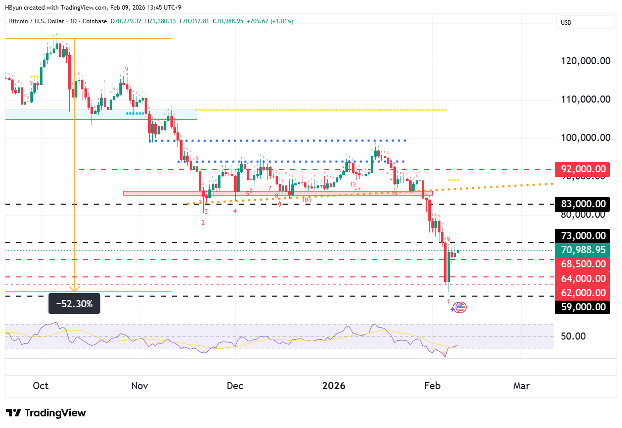 Key levels remain well defined. The $60,000–$62,000 range now represents the most important structural support zone, aligning with historical cost basis clusters and the area where buyers aggressively stepped in during the recent flush. A sustained hold above this level would strengthen the case that Bitcoin is entering a broader accumulation phase. On the upside, reclaiming the $73,000 level, which previously served as support before the breakdown, would represent the first sign of structural recovery and reduce the likelihood of immediate continuation lower.