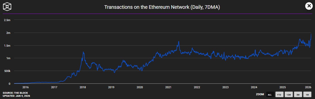 At the same time, Ethereum’s on-chain usage is accelerating. The number of daily transactions on the network recently surged to a new all-time high. According to The Block, the seven day moving average of Ethereum transactions reached 1.87 million on December 31, surpassing the prior peak of 1.61 million recorded in May 2021 during the height of the DeFi and NFT cycle, as well as the more recent high of 1.73 million set in August 2025. Active addresses also ended the year at their highest level since May 2021, reaching 728,904, while Ethereum recorded more than 270,000 new addresses in a single day, the largest increase since early 2018. Analysts attribute this surge in activity to a combination of protocol improvements and institutional engagement. Recent upgrades have materially reduced fees, improved scalability, and helped attract institutional participation through ETFs and real world asset tokenization.