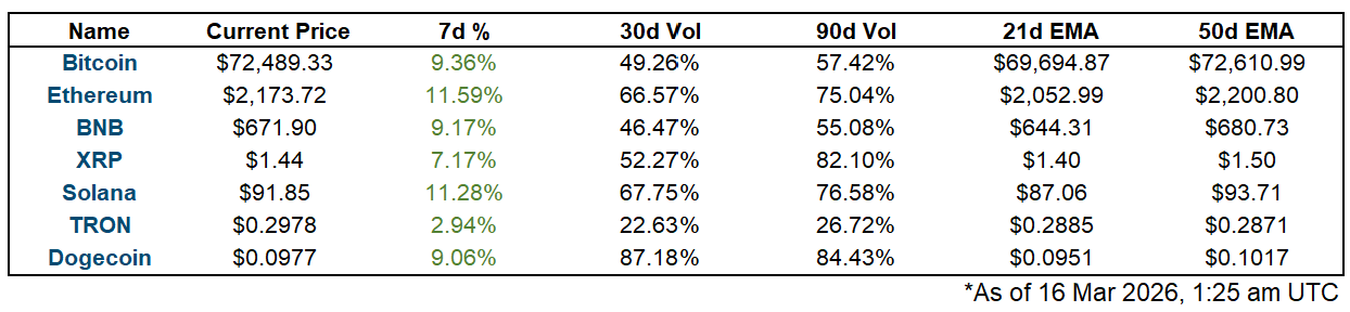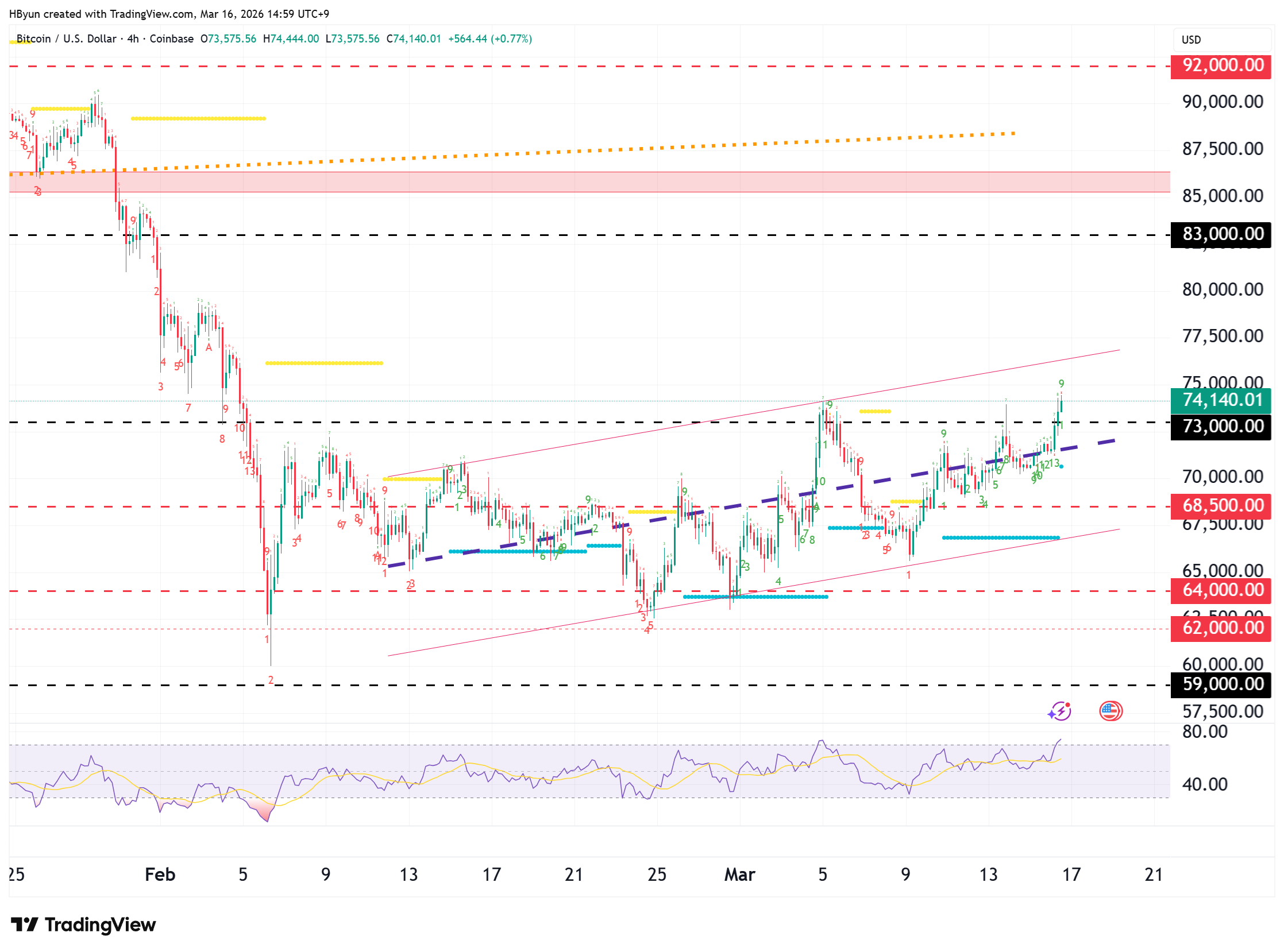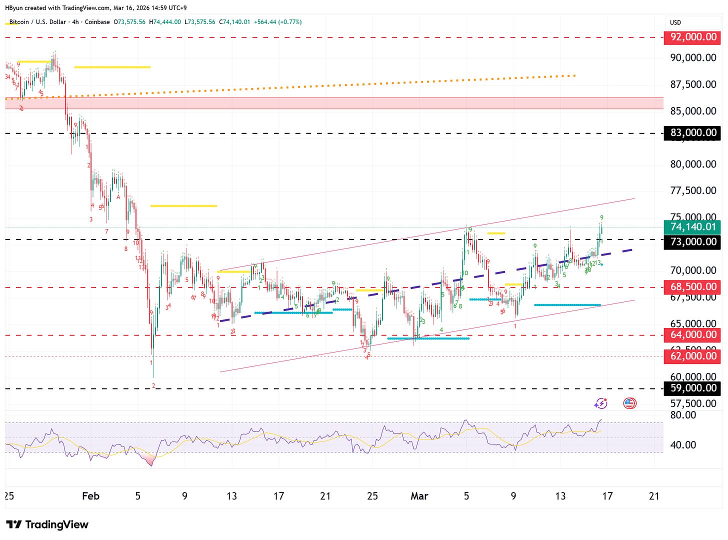 Bitcoin continued its gradual recovery, climbing back toward the $74,000 region and testing levels not seen since the initial February breakdown. Price action has been forming a steady upward channel since the capitulation low near $60,000, with higher lows and higher highs gradually rebuilding market structure.